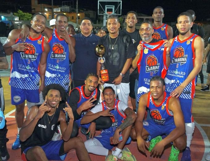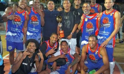 El dirigente Gary Santana (Germín), de La Marina, sostiene la Copa Seaboard que conquistaron en el torneo intercalles del club La Ciénaga, junto a los jugadores....