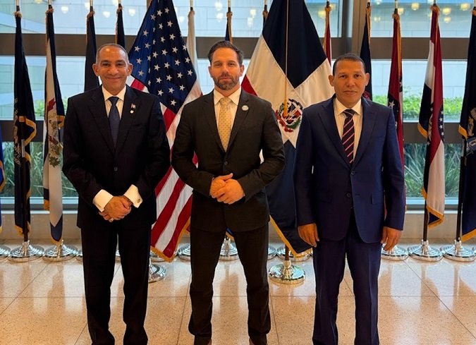 Michael Buemi, José Manuel Cabrera Ulloa y Luis Soto, durante el encuentro este 19 de marzo del 2026. SANTO DOMINGO.– El subsecretario adjunto de Guerra para...
