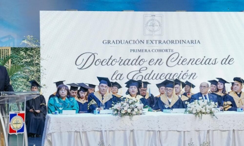 El ministro de Educación, Luis Miguel Decamps, habla durante una ceremonia en la que fueron graduados los primeros 16 doctores en Ciencias de la Educación, de...