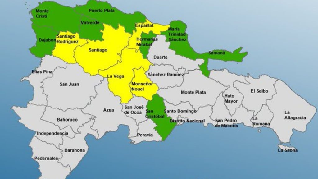 Las provincias en alerta amarilla son: La Vega, Monseñor Nouel, Santiago, Santiago Rodríguez, y Espaillat. Esta alerta se debe a las imágenes de satélites meteorológicos que indican la presencia de nubes con gran desarrollo vertical, generadoras de aguaceros moderados a fuertes que podrían afectar la zona.