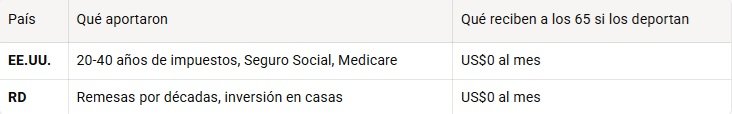 1- No califican para pensión solidaria: Para el régimen subsidiado de República Dominicana hay que ser pobre y residir 10 años continuos antes de los 65. Los deportados llegan con 60+ y sin historial (CONAPE, 2026).